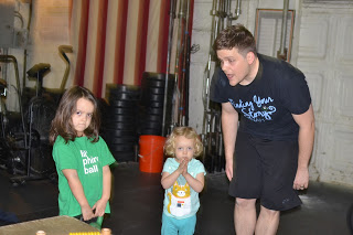 This WOD was being run all day long at KOP, but the 9:30am class was the special friends and family version. Participants were encouraged to make a small donation to this month's charity, the Unitarian Universalist Service Committee. (Note: KOP has been raising money for different charities each month. Every time an athlete checks in on Facebook using #checkinforcharity along with that month's "phrase that pays", 10 cents goes to the charity. Many athletes times 30 days or so per month times a dime results in a nice little contribution to these charities.) I arrived at the gym just as Coach Aimee was rounding up the massive group that had shown up for this class. I wasn't sure who I'd be partnering up with. Then I heard Cline swear in front of one of the kids in attendance and it became clear that I had to partner up with him. (The Lord works in mysterious ways. Or something like that.)